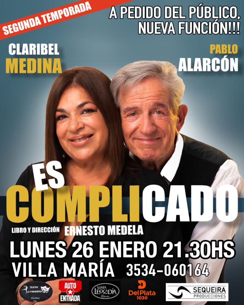 Se hará la comedia «Es complicado» con Pablo Alarcón y Claribel Medina. Segunda función: lunes 26 de enero a las 21.30 hs. La Panadería (Salta y José Ingenieros)