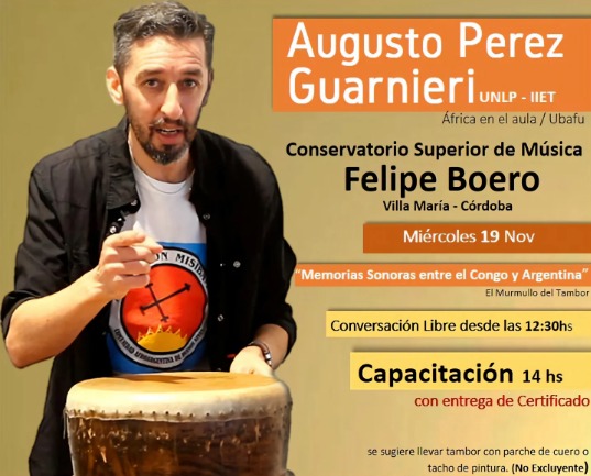 Estará a cargo de Augusto Pérez Guarnieri (tamborero, Doctor en Ciencias Sociales y Magíster en Antropología Social). Primero: conversación libre a las 14.30 hs y capacitación desde las 14 hs . Conservatorio Superior de Música Felipe Boero (España 1174)