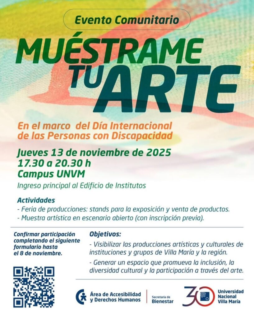 Evento comunitario: MUÉSTRAME TU ARTE | En el marco del «Día Internacional de las Personas con Discapacidad». Campus UNVM – Ingreso principal al Edificio de Institutos