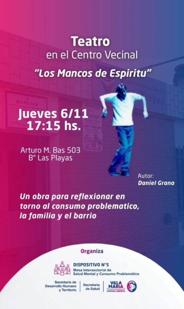 Se presentará la obra «Los mancos de espíritu» de Daniel Grana. Aborda el consumo problemático.