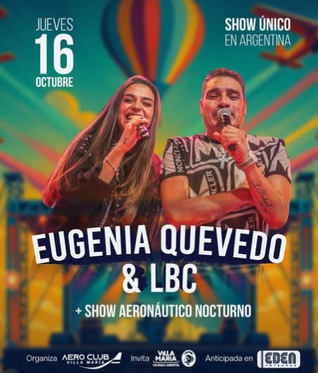 El Festival Aeronáutico Villa María 2025 despega con todo. Con Eugenia Quevedo & La Banda de Carlitos. Además, un imperdible show aéreo nocturno para toda la familia.
