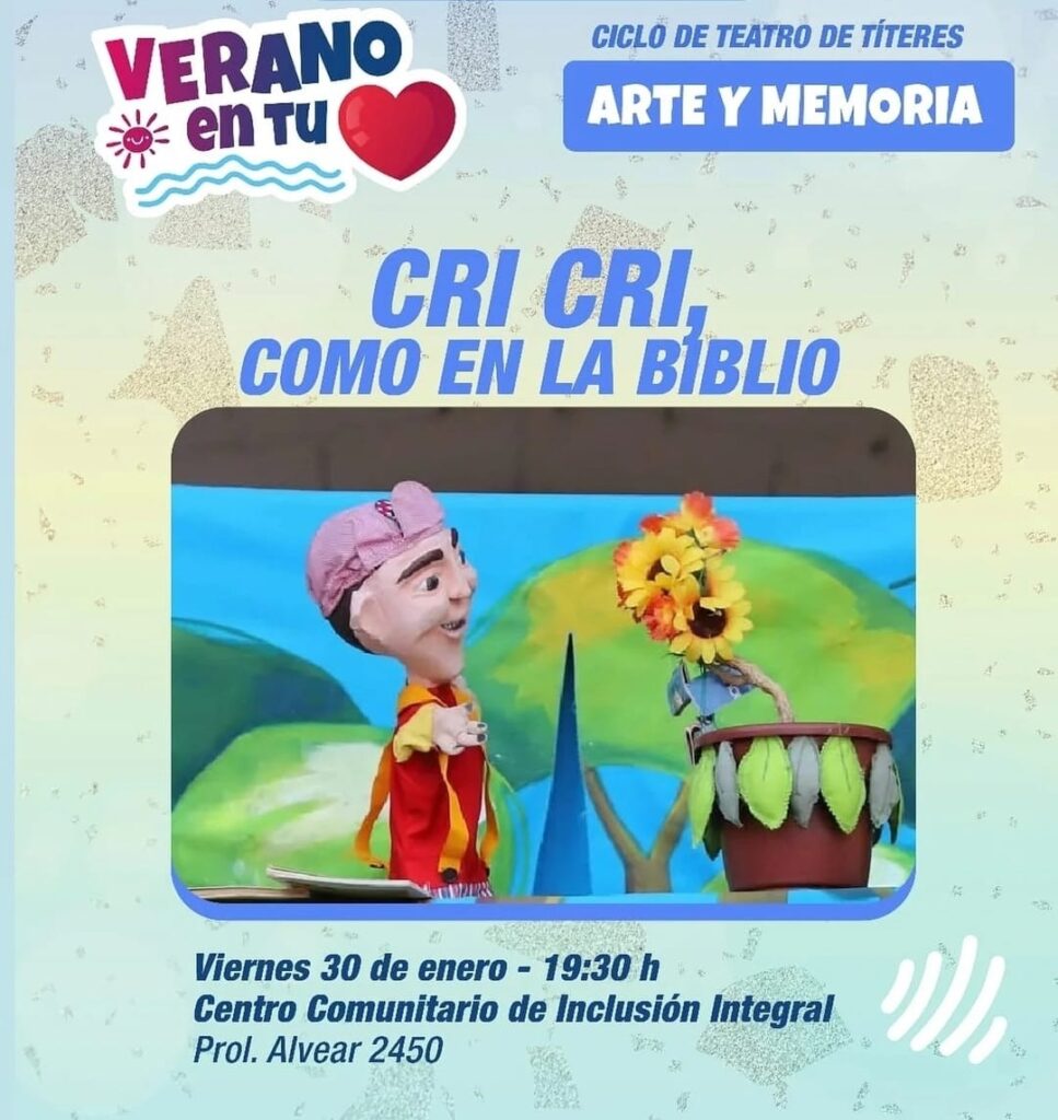 Se desarrollará la actividad de teatro de títeres «Cri cri, como en la Biblio», para niños y niñas.
