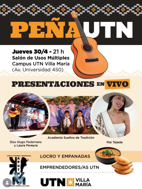 Actuarán: Dúo Hugo Pedernera y Laura Pereyra, Mai Tejeda y academia Sueños de Tradición. Habrá locro y empanadas. SUM UTN Villa María (av Universidad 450) Gratuito