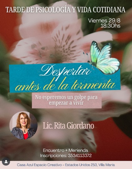 La Lic. Rita Giordano te invita a pasar una tarde de psicologia para reflexionar y disfrutar de una merienda en Casa Azul (Estados Unidos 253)