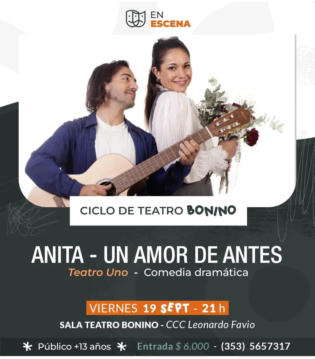 Anita, presenta su obra de comedia dramática "Un Amor de Antes". Vení a disfrutar del ciclo de teatro Bonino. Público mayor de trece años. Valor de entrada: $6000. Reservala al (353) 5657317 En Sala Teatro Bonino, CCC Leonardo Favio. Dirección: Sabattini 200 |