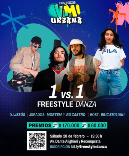 1 vs. 1 Freestyle Danza 💃Sábado 28 de febrero Con premios de $170.000 y $60.000 Batalla de Rap Domingo 1 de marzo Con premios de $170.000 y $60.000. ( 28/02/2026 al 01/03/2026 ) Av Alighieri y Reconquista Gratuito