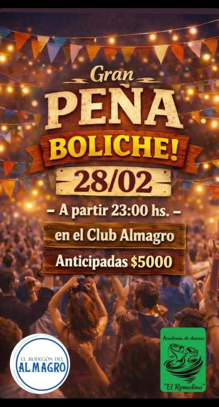 Se hará una "Peña boliche", a cargo de la academia de danzas El Remolino. Club Almagro (Santiago del Estero 567) |