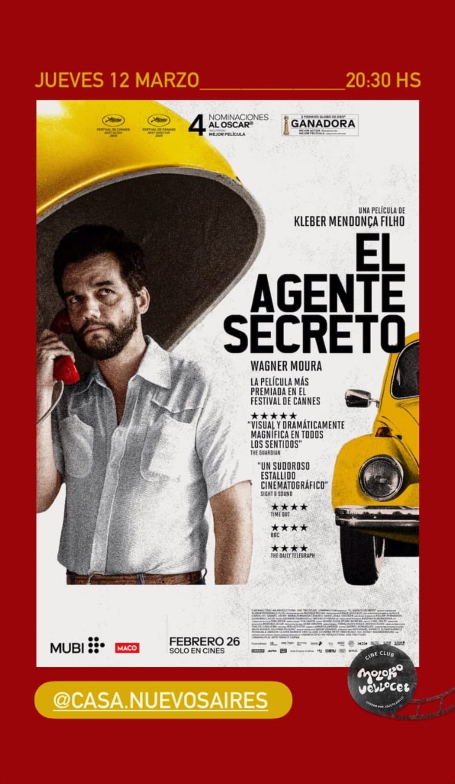 Se exhibirá el filme "El agente secreto", en el marco del cineclub Moloko Vellocet. Casa Nuevos Aires (Bs As 351)