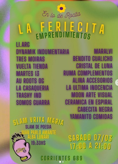 Feria de emprendedores y SLAM VRIYA MARIA a las 19.30 por @juanpabloamante y @alba_lunari. En lo de Rocita (Corrientes 689) Gratuito