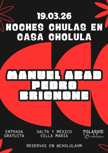 Actuarán Manuel Abad & Pedro Brignone para una noche de música en vivo y buena comida. Casa Cholula (Salta y México) Gratuito |