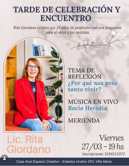 La psicóloga Rita Giordano celebra sus 25 años de profesión con una propuesta para el alma y los sentidos. Música en vivo a cargo de Rocío Heredia con un repertorio único. Casa Azul (Estados Unidos 253)