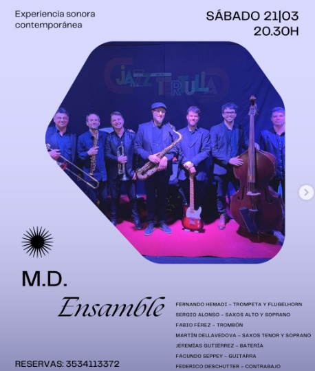 Siete músicos en el escenario creando una experiencia sonora contemporánea y jazz imperdible. Casa Azul (Estados Unidos 253)