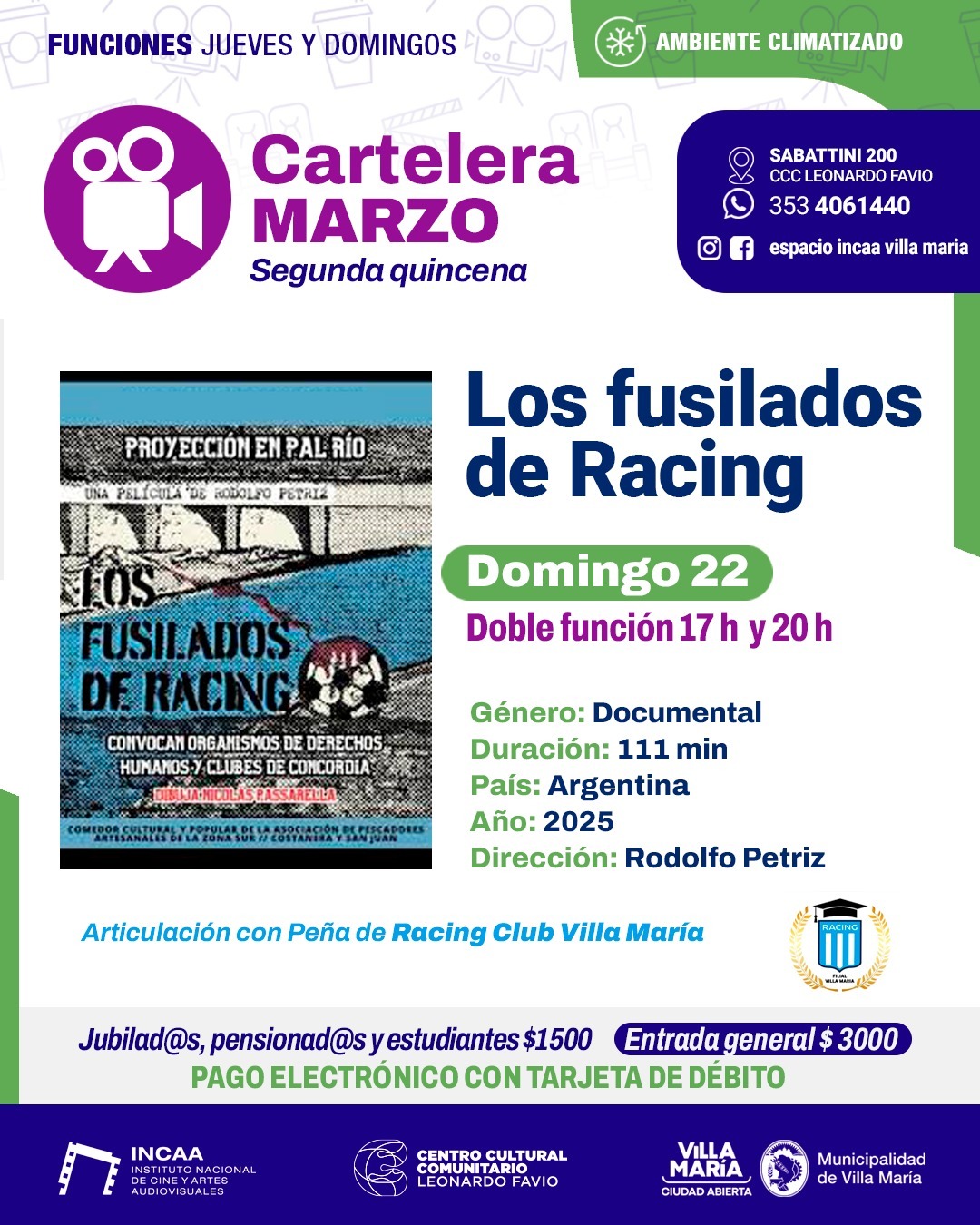 Documental "Los fusilados de Racing" de Rodrigo Petriz, con acompañamiento de la peña local de Racing. Espacio INCAA (Sabattini 200)