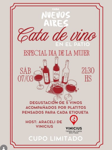 Disfruta de una selección de vinos exclusivos, acompañados de maridaje gourmet y exquisito postre . Casa Nuevos Aires (Bs As 351)